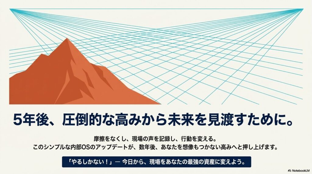 毎日5分でも良いので自分の声をAIに預け、客観的なデータとして見直す。このシンプルなルーティンが、5年後のあなたを、高い山の上から未来を見渡せるような、圧倒的な存在へと成長させるでしょう。