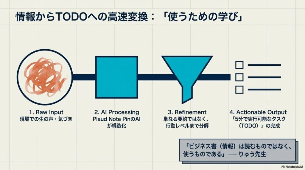 • TODOへの分解: 学んだ抽象的な哲学を、「実行可能なタスク」にまで分解します。